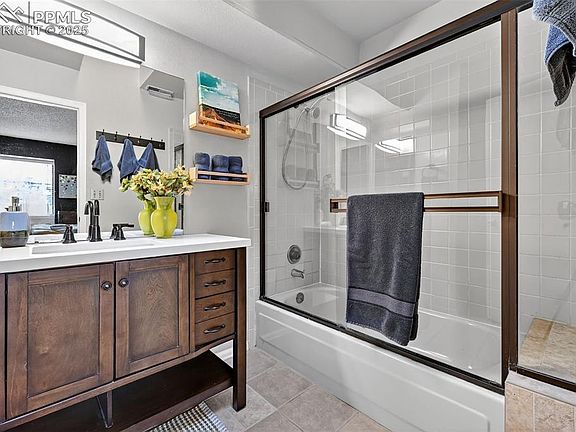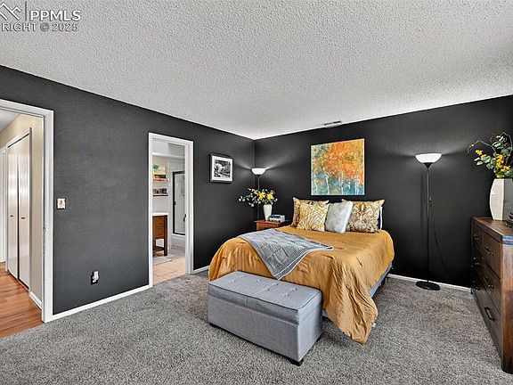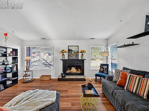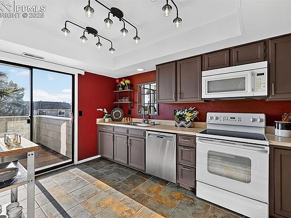 Desirable D20 Schools townhome on the West Side with 2 car garage. Easy access to I-25 on the north end of Colorado Springs. Includes Oversized, Private composite balcony overlooking the front range mountains. Open floor plan with vaulted ceilings and plenty of natural light. Newer luxury vinyl wood flooring and contemporary colors. Spacious living room with wood burning fireplace. Oversized kitchen with slider to private deck. Stainless steel appliances, painted cabinets, and contemporary lighting. Bay window seating for formal dining. Large Primary suite features attached full bathroom and two full-sized closets. Additional oversized bedroom with attached jack and jill full bathroom and extra deep closets. All living spaces on the same level with convenient access to washer and dryer between bedrooms. Washer and Dryer stay! Water heater replaced in 2025, A/C 2021, Furnace 2019. HO6 policy with new roof in 2019. HOA Amenities include: pool, community room, outdoor courts, weight room, pool table, sauna, all landscaping, insurance coverage of all exterior. Savings on homeowner’s insurance with HO6 policy. Backs to trails and open space at the back of the neighborhood, quiet location with mature trees and wildlife. Close to Ute Park and trails, D20 Schools, Fire Station, shopping. Restaurants, Crepe Donuts, Josh & John’s ice cream, and so much more! Rockrimmon on the West Side? Yes, please. Add Award-winning D20 schools, and it’s a total WIN!