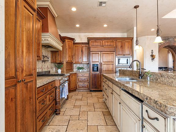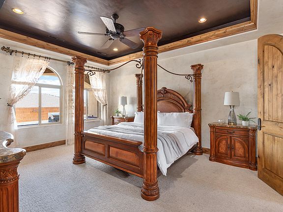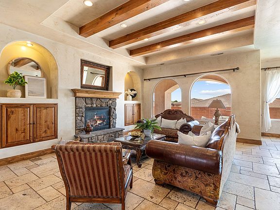 Your perfect Tuscany retreat in the heart of Ivins awaits! This home truly has it all — from the sparkling pool and private courtyard with gorgeous views, to the oversized 4-car garage that fits all your gear. The home features a remarkable multi-level layout perfect for entertaining and creating memories with family and friends. At the entrance, you are welcome by the serene sounds of the water feature in the large courtyard. Once you walk through the large arch glass wooden doors, you will experience a large open floor concept that includes the large upstairs living room, kitchen, and dining area with large mountain view windows. The home features 5,544 SqFt (2,772 on each floor), 6 bedrooms, 6 bathrooms, theater room, 2x flex rooms, Office/Den, large storage room granite honed edge countertops throughout, and wood beam living room ceilings. Inside, the kitchen is a chef's delight with a large multi-tier island, a built-in fridge, and a hidden pantry big enough for all your needs, knotty alder cabinets, 6 burner chef freestanding stove, and built-in swivel island chairs. The spacious primary bedroom is a relaxing escape, complete with its own secluded flex room, a custom built-in closet, a spa-like bath with a triple-head shower, separate soaking tub, and large sauna room. The finished basement has a large 2nd living room that is perfect for a game room. Movie nights? This home has you covered, thanks to your very own theater room. You'll also love the large mudroom, laundry space, kitchenette, and a den perfect for work or hobbies. The outdoor space is a wonderful entertainment space with Outside, fire up the built-in barbecue and fridge under the covered patio, and enjoy effortless entertaining.