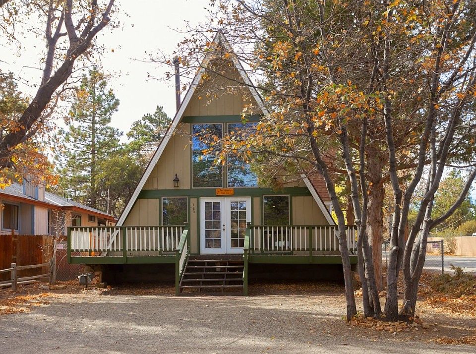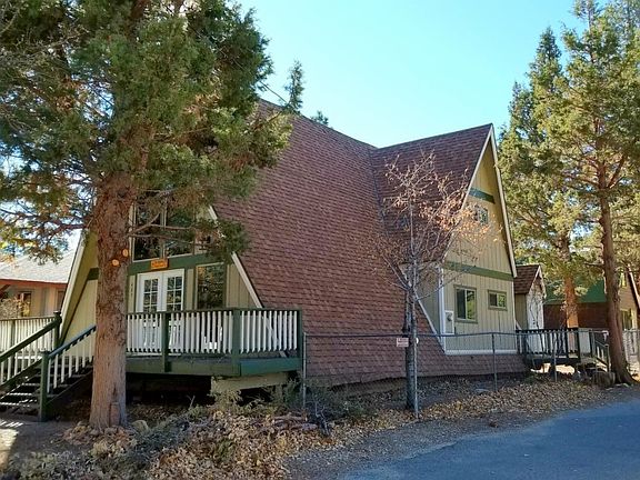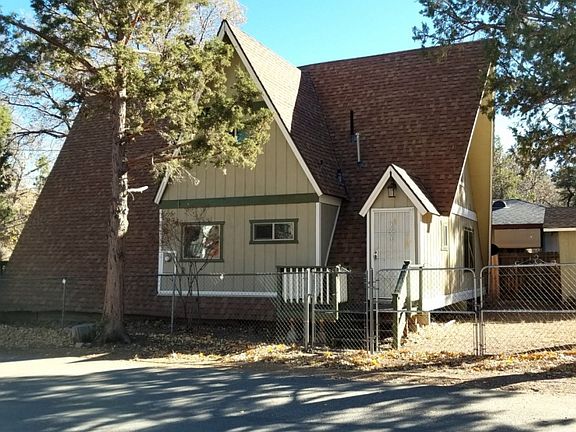Immaculate A-Frame cabin with a pretty setting on a level corner lot. Inviting entrance with french doors that open into the charming living area. Spacious living room has wood burning stove, open kitchen with island breakfast bar and pantry, light and bright interior. 3 bedrooms (one is a sleeping area) plus loft and 2 upgraded baths - one upstairs and one down, separate laundry closet, new dual pane windows and window treatments. Large front deck, fenced yard with storage shed in back and plenty of parking in front, along side and through the double gates entering into back yard. This well maintained, turnkey cabin comes furnished and ready for you to enjoy. Must see!