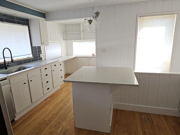 Upstairs features 2 bedrooms, open dining and living room space leading to wrap around outdoor deck. Large kitchen features tons of cabinets.