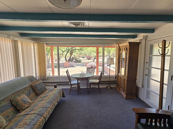 Inside, the bright and airy living area showcases charming architectural details including teal-painted ceiling beams that add character and southwestern flair. Large picture windows frame beautiful desert garden views, while the open layout flows from the comfortable living space to a glimpse of the kitchen area. The interior combines classic southwestern elements with practical comforts, featuring carpeted floors, select antique furniture pieces, and all the amenities needed for a relaxing stay.