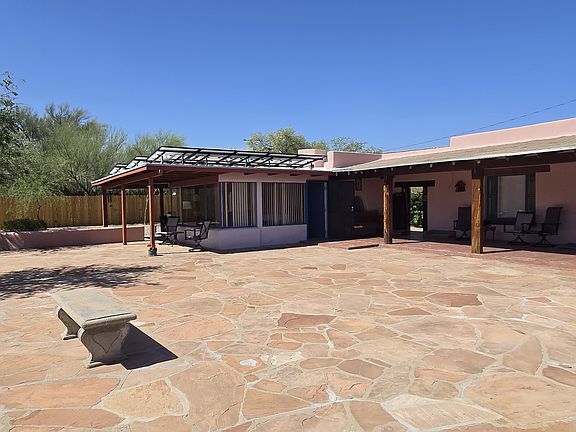 Fenced yardNatural desert landscapingMature treesSelect antique furniture piecesPink adobe-style exteriorSpacious covered patioStone tile patio