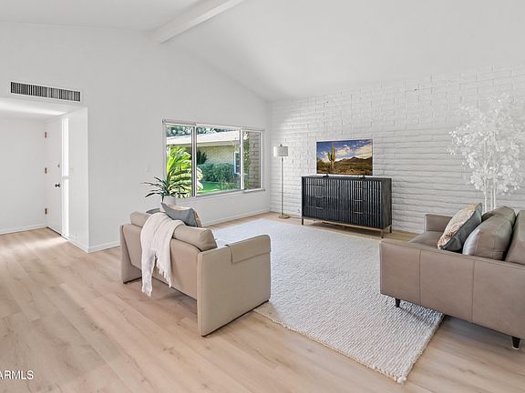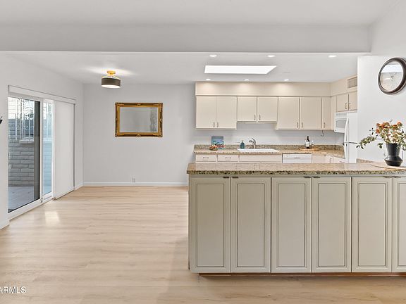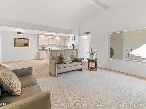 This Single-level Mid-Century patio home, in a guard(24/7)-gated, lush, resort-style community, is move-in ready. Bright and open with vaulted ceilings, skylights, updated tile and new vinyl flooring, granite counters, fresh paint & dual-pane windows. The spacious Primary Bedroom has lushly landscaped views and a full ensuite. Both bedrooms feature walk-in closets, and the home includes in-unit laundry and a private patio with Views of Camelback Mountain! Enjoy the resort style heated pool, spa, clubhouse, fitness center, and the on-site restaurant. This 40+acre unique community is in walking distance to Scottsdale Fashion Square, The Scottsdale Waterfront; featuring some of Arizona's Best Restaurants, shopping, parks, golf courses & hiking trails.