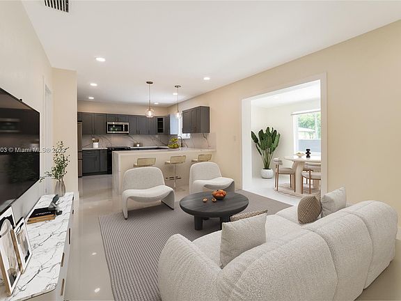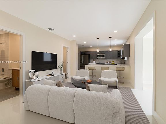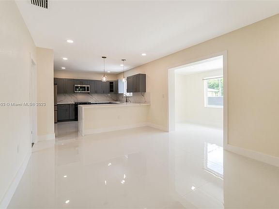LOCATION LOCATION! LOVELY HOME IN THE MOST DESIRABLE AREA! This large 3-bedroom/2-bathroom wholly remodeled home features a 2023 roof, impact-proof windows and doors, gorgeous landscaping, and a massive driveway guiding you to a massive covered garage. State-of-the-art property with a stylish kitchen with grey wood cabinetry, quartz countertops and stainless steel high-end appliances, full washer and dryer, porcelain and tile floors, one-of-a-kind bathrooms, closet cabinetry, and much more. Ideal location close to the beaches, Wynwood, Design District, Midtown, and Downtown. **Pictures have been virtually staged to show potential.