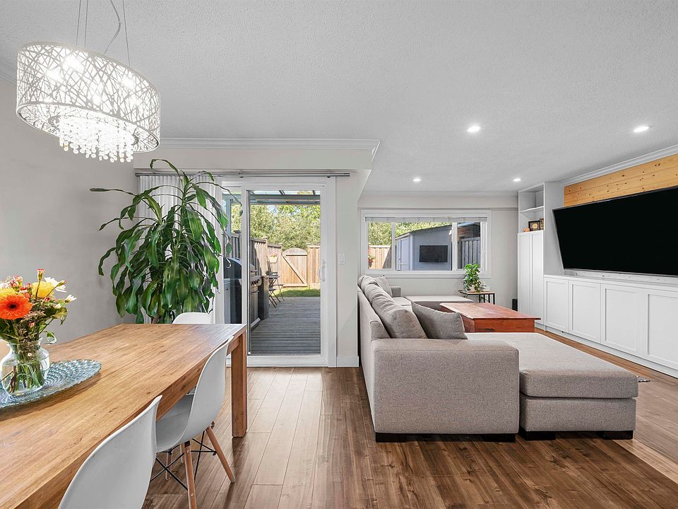 Stunning, fully renovated 3 bedroom, 2 bathroom, end unit townhouse in sought-after Steveston! This 1,428 sqft gem boasts an open-concept layout with a gourmet kitchen featuring quartz countertops, designer backsplash, and stainless steel appliances. The bright living area radiates with natural light, showcasing pot lights, laminate floors, electric fireplace, and custom built-in shelving around a stylish entertainment hub. Upstairs, three spacious bedrooms include a master with walk-in closet, remote-controlled blackout blinds, plus a spa-inspired bathroom with heated floors. Enjoy a private patio, perfect for gatherings, with outdoor TV and storage shed. Well-run strata, with EV charging, new fencing, and a warm community feel. Steps to Steveston Village, shops, parks, and top schools.