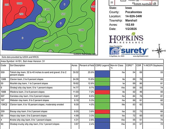 Certified Organic farm, pattern tiled, and in a high state of fertility located in Pocahontas County, Iowa now available as a solid investment opportunity in the heart of northwest Iowa's agricultural region. Buyer will receive 2025 lease income with current certified organic operators holding three year lease, providing investment stability for Buyer. Square farm holding 160 total gross acres m/l,, 159.37 taxable acres m/l, and cropland acres from FSA 154.25 m/l with Corn Suitability Rating of 69.6 (CSR2). This farm is an excellent opportunity for a Buyer looking to invest in Iowa farm ground and/or organically grown crops.