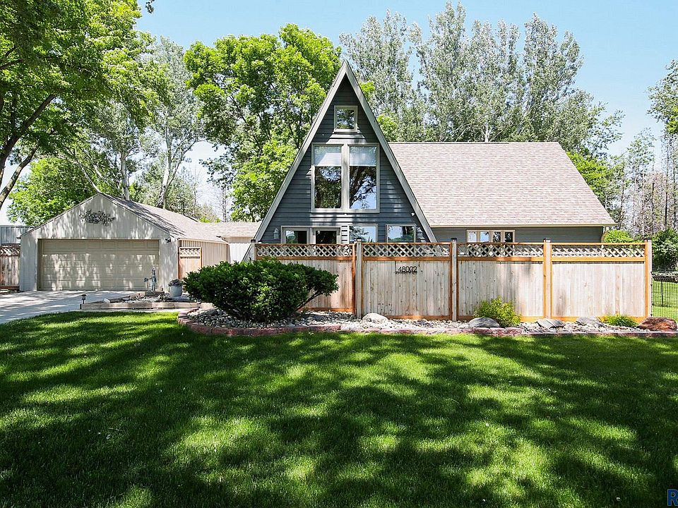 This unique A-frame 4 bedroom, 2 bath home could be yours! Set on nearly 1 acre in a beautiful rural setting, this home features loads of mature trees, country living just minutes from Sioux Falls, and so many updates in this well maintained home! With a double attached garage, and an awesome attached workshop you will love the convenience offered. In addition, there are 2 sheds and an OUTHOUSE you will have to see to believe! Many improvements done since the home was purchased 5 years ago. Here a just a few of them: new roof was installed over garage, shop and chicken area and new gutters were installed, new shingles on roof on main home, new deck with privacy fence, new rock and landscaping, new concrete driveway and so much more!!! You will love the peace and quiet. Listing Agent is related to the Seller.