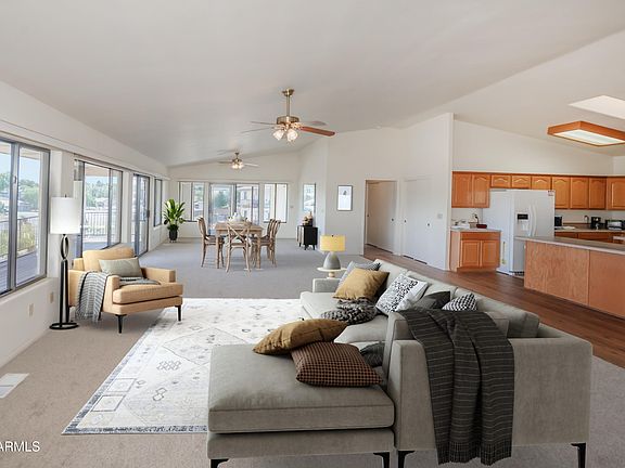 Outstanding Opportunity to own this 2675 Square Foot home in Desirable Unit 19 of Prescott Valley...close to all Shopping, Medical Offices, Hospital, & Entertainment. Enjoy the Fabulous VIEWS of the Mingus Mountain Range & the Bradshaw Mountains from the Wall of Windows in the GREAT ROOM!! Home features 3Bedrooms/2Bathrooms/2CarGarage + (8x10 Workshop), Office/Den, 14'x15' ARIZONA Room (Passive Solar), Vaulted Ceiling in Great Room, (3) Skylights, Gas Fireplace w/blower, Vertical Blinds & Pleated Shades, New Carpet in the Living Room & Master Bedroom, Plus New Vinyl Plank Flooring in the Kitchen, Hallway, and both Baths! Kitchen is well appointed with Oak Cabinetry, Laminate countertops, Quality White Appliances (Inc. Fridge), Wall Oven, Electric Cook top, ISLAND, Breakfast Bar... w/Barstools, & Pantry. Master is Spacious, has Dual Sinks, Large Shower, & Walk-In Closet. Has large Laundry Room w/Upper and Lower Cabinetry, Laundry Sink, & Storage. Additional Features include 1476 Sq Ft Unfinished Basement as a BONUS area with access from main floor with lots of Potential to be a massive Family Room or whatever your imagination can come up with......Guest Bedrooms are large, has large Covered Deck with Sun Screen, large Front Porch, & is Priced to Sell!!