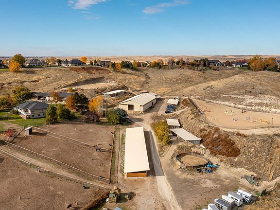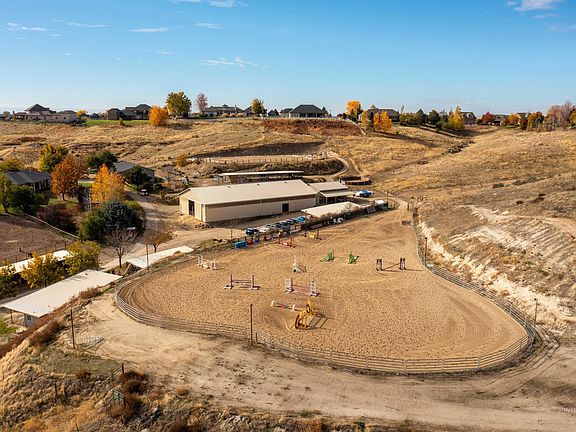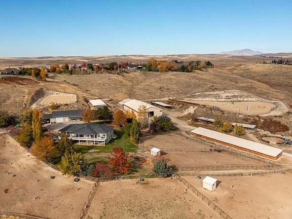 Treasure Valley Equestrian Paradise! This remodeled estate offers over 6,000 sq ft of luxury living between the main house and guest house. Vaulted ceilings, hardwood floors, a chef’s kitchen featuring solid-surface counters and top-tier appliances, a serene master retreat, main-level office, and multiple spacious living areas. Enjoy breathtaking views of Bogus Basin, the Owyhee Mountains, and the rolling hills of Star from the expansive wraparound covered deck. A modern guest house is perfect for guests and staff providing comfort and privacy with solid-surface counters and en-suite baths for each bedroom. For the equestrian enthusiast, the property boasts a 7,200 sq ft covered riding arena with lighting, a 193x91 sand arena, and a third riding arena nearly an acre in size w/ stunning mountain views. Over 35 stalls, multiple pastures, tack rooms, rider lockers & equestrian office. Additional amenities include a detached 30x20 garage, 40x30 RV carport, and a 3-car garage at the main residence.