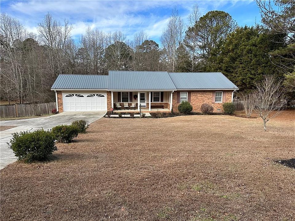 No HOA! Highly sought after RANCH! This cozy home is nestled back off the road with a long driveway on a beautiful full acre lot, with a lovely screened porch overlooking a peaceful, large, fenced backyard! Step into the foyer & family room with vaulted ceiling & wood burning fireplace. The family room has plenty of natural light. Enjoy meals with the family in the separate dining room. The vaulted country kitchen has plenty of cabinets & new white subway tile backsplash, and comes with Refrigerator. Kitchen upgrades include solid surface countertops and modern appliances! At days end, retire to the owner's suite with tray ceiling. Both bathrooms have newer toilets and vanities. Laundry area has plenty of cabinets above w/d. You will want to spend time in the large screened porch leading to an additional exterior deck with stairs to the back yard. There is a good-sized craftsman shop/storage shed with concrete slab and electricity. Garage has a storage room, and the garage floor is tiled. Newer HVAC, and the metal roof is about 8 years old, providing decades of carefree concerns. Easy maintenance vinyl siding. Newer gutters. Ready to move in! This home will not last long!