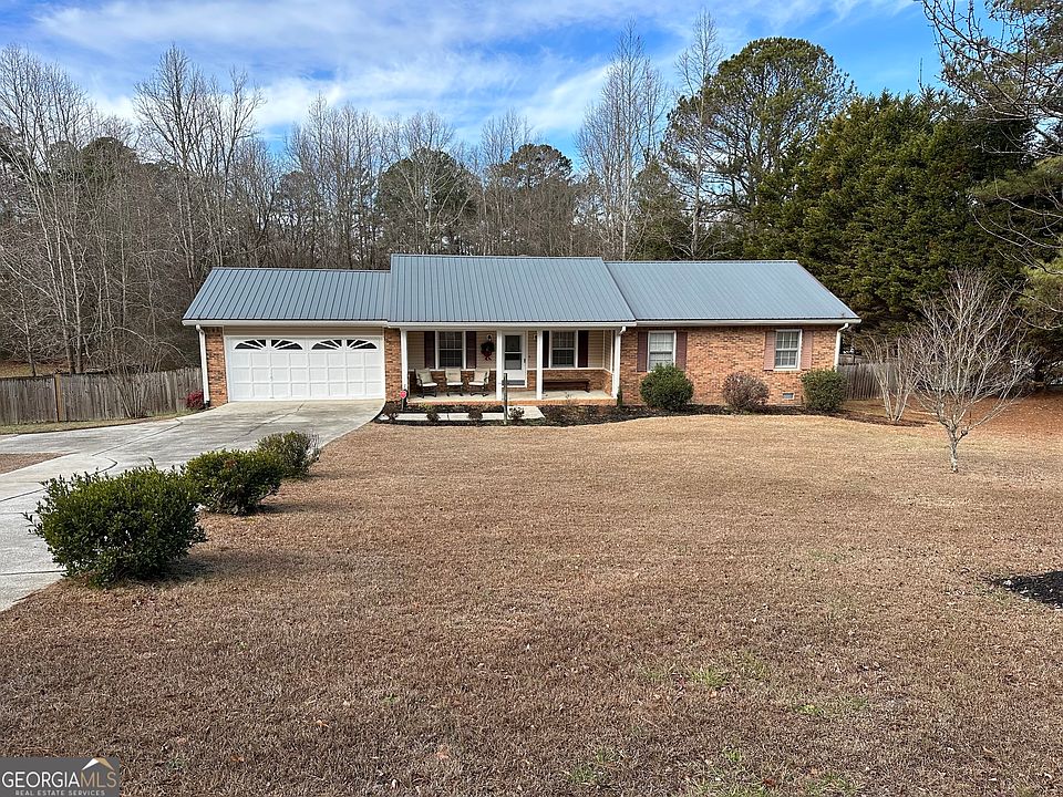 No HOA! Highly sought after RANCH! This cozy home is nestled back off the road with a long driveway on a beautiful full acre lot, with a lovely screened porch overlooking a peaceful, large, fenced backyard! Step into the foyer & family room with vaulted ceiling & wood burning fireplace. The family room has plenty of natural light. Enjoy meals with the family in the separate dining room. The vaulted country kitchen has plenty of cabinets & new white subway tile backsplash, and comes with refrigerator. Upgraded granite countertops and new flooring with stainless steel microwave. At days end, retire to the owner's suite with tray ceiling. Both bathrooms have newer toilets and vanities. Laundry area has plenty of cabinets above w/d. You will want to spend time in the large screened porch leading to an additional exterior deck with stairs to the back yard. There is a good-sized craftsman shop/storage shed with concrete slab and electricity. Garage has a storage room, and the garage floor is tiled. Newer HVAC, and the metal roof is about 8 years old, providing decades of carefree concerns. Easy maintenance vinyl siding. Newer gutters. Ready to move in! This home will not last long!