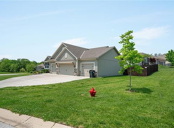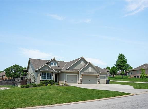 $5000 closing cost, interest rate buy down, or landscaping allowance to the buyer with accepted offer. Beautiful ONE OWNER 4 Bed, 3 full bath, corner lot home with a car lover's delight 4 car garage. Open floor plan with kitchen, dining room, and living room. Three large windows allow for so much natural light as do another two large windows in the dining room. The kitchen has granite countertops and a center island with a sink. Unique corner refrigerator, stove, and microwave all stay. A large pantry is a nice addition with a mudroom between the kitchen and a massive garage. Main floor master with stone double-headed shower, double sink, and a very spacious 8' x 21' walk-in closet. An open staircase leads to a carpeted lower-level family room and two additional sunlit bedrooms, a full double sink bath, and another huge walk-in closet. Over 400 sq ft of storage. This corner lot home is convenient to "A" rated Blue Springs schools.