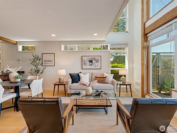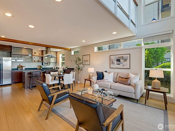 Light and airy townhome with expansive views of Puget Sound & Olympic Mountains in the heart of the Alaska Junction! Enter through the private patio to discover a living room w/ 20' ceilings, exposed wood beams, and an abundance of natural light. Well-appointed kitchen w/ gas cooking, SS appliances, & soapstone countertops complete the main floor. The loft-style primary suite spans the entire top floor, showcasing stunning westerly views and features a 3/4 bath, walk-in closet and W/D. The lower level includes 2nd bedroom, full bath, another W/D, family room, & direct access to secure garage w/ closest parking space. Restaurants, bars, shops, grocery, Farmers Market, & bus lines are all one block away. Seller-procured inspection available.
