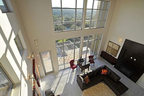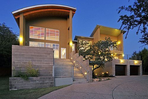 Amazing very contemporary architecture with walls of windows to take in the panoramic hill country and lake views. "Green Built" home. Multiple outdoor terraces, composite deck in wooded backyard. Metal roof, suspension hallways, curved wood ceiling, elevator. Media/theatre room on main level. Open floorplan. Honed marble kitchen counters, double ovens, picture window looking into backyard. Water feature, unique property with impressive features/quality