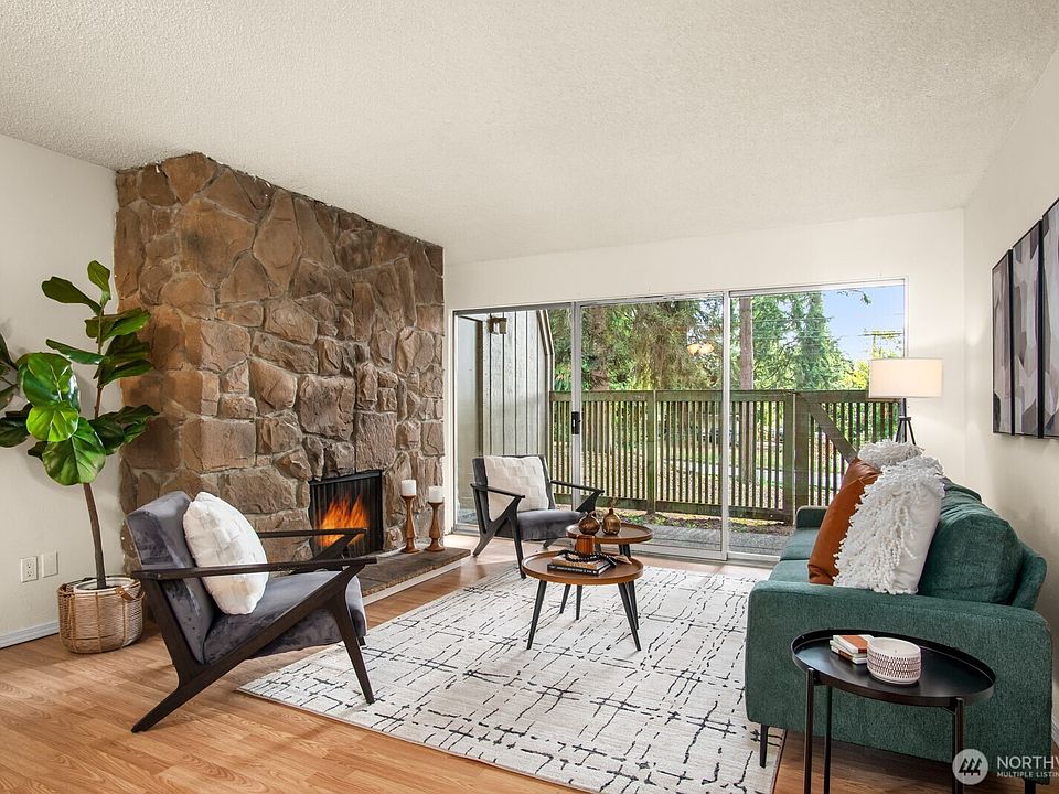 This charming ground-floor condo offers an ideal blend of comfort and character. You'll be greeted by a bright kitchen with a convenient pass through, allowing for a view to the living area and lovely breakfast bar. Centered in the living space is a gorgeous floor-to-ceiling, wood burning stone fireplace, perfect as a statement piece and a cozy necessity in cooler months. Right off the main area you will find a full bathroom which is functionally located between both generous sized bedrooms. Throughout the space, large windows invite natural light while the ground level location offers easy access. If you're looking for a quiet residence that is also steps away from major grocery stores, don't miss your chance!