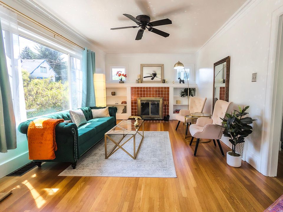 The main floor living room is perfect for entertaining. It's complete with a mid-century velvet Chesterfield sofa, two accent armchairs, built-in bookshelves, modern art pieces, and a decorative fireplace. This is a great place to read, sneak in a cat nap, work on your laptop, or host a family game night.