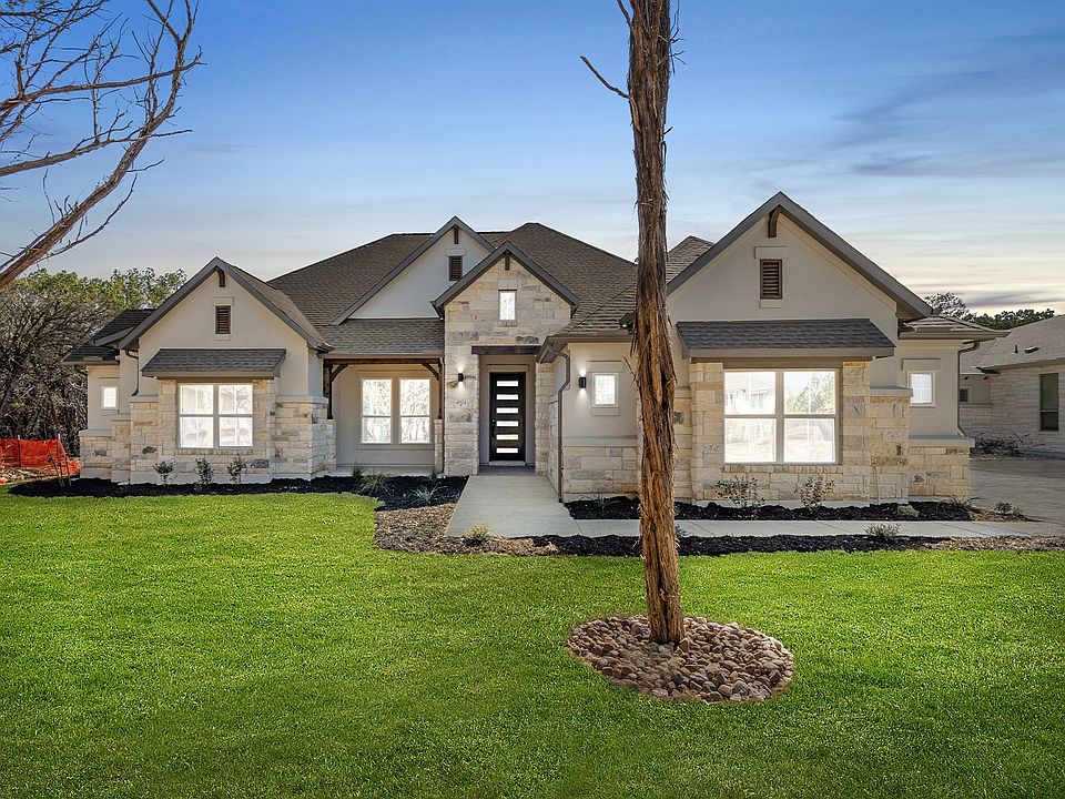 READY NOW! Welcome home to a large front porch perfect for relaxing after a long day. After dinner, you can enjoy a peaceful night under the stars from the huge covered patio that overlooks the oversized wooded lot. As you walk in, you will be astounded by the architectural details in the expansive entry. The chef's dream kitchen comes complete with stainless-steel built-in appliances including a 5-burner stove, huge quartz island, walk-in pantry and abundant white custom cabinetry. The primary bath has all the necessities to relax, including a large walk-in closet, spacious shower with a seat, and a soaking tub. Enjoy a cozy fireplace ideal for a cold night in. Entertaining friends and family is a delight in the enormous game room, surrounded by windows and natural light. This home is everything you are looking for in a single-story, open floor plan. Come enjoy lakeside living in the beautiful Hollows community!