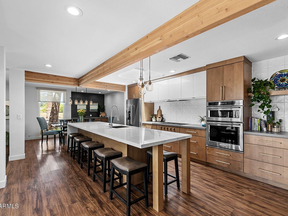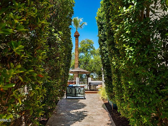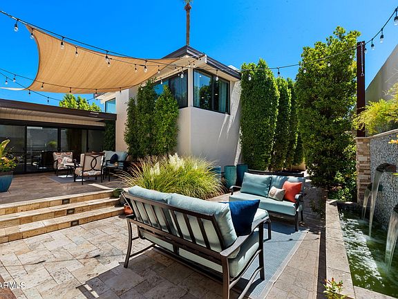 Welcome to an exceptional retreat nestled in the heart of Arcadia Green, one of the area's most coveted mid-century modern communities. This fully renovated residence blends architectural integrity with contemporary sophistication, offering an entertainer's dream and a chef's haven in one elegant package. Step inside to discover seamless indoor-outdoor living, where expansive sliders open to a lush courtyard featuring an outdoor fountain wall, a fully equipped natural gas BBQ, refrigerator and entertainment zone, and a spa for year-round relaxation, all framed by Italian travertine flooring and Brazilian hardwood decking. The chef's kitchen is a true centerpiece: flush gas Wolf cooktop, custom Alderwood cabinetry is continuous throughout the kitchen, dining, and bath, and show-stopping lighting details that elevate every culinary moment. Porcelain countertops, designer fixtures, and high-end KitchenAid appliances complete the space, while a sunroof-style skylight bathes the room in natural light. With the ability to comfortably seat 35 guests, this home was designed to host. Whether an intimate dinner or a grand celebration. Every inch has been thoughtfully curated, from custom light fixtures to the Delta Trinsic bath fixtures, back-lit mirrors and elegant planter boxes.