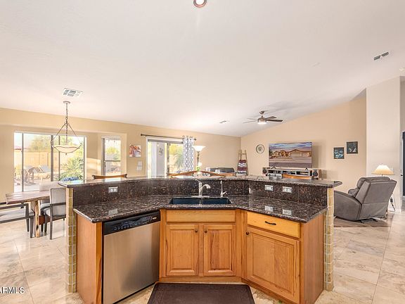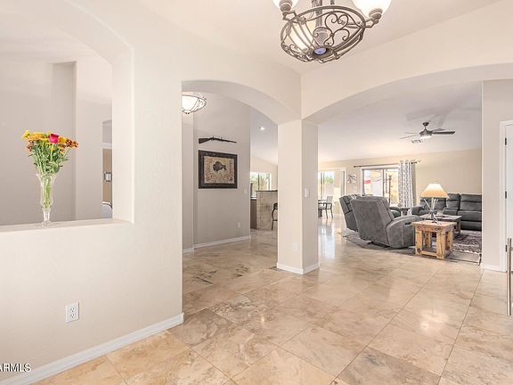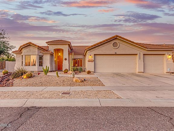 DESERT RETREAT ON PRIVATE 1/4 ACRE IN GATED COMMUNITY! Great Room Floorplan Features 3 Bedrooms w/Split Master & Flex Room Used For Dining, Den Or Office. Interior Showcases Vaulted Ceilings, Two Tone Paint, Plantation Shutters, Travertine w/Mosaics & Wood Look Tile Flooring, Custom Stone Backsplashes & Inlays In Kitchen, Showers, Baths & View Windows Galore. Kitchen Boasts Hickory Cabinets, Granite Counters, Breakfast Bar & Dine In Area. Entertain In Your Resort Backyard Under Your Gazebo w/Bar, Pool, Spa, Water Feature, Gas Firepit & Built In BBQ As You Take In The Sunset & Mt Views. Spacious 3 Car Garage Has Cabinets, Side Shed Storage, PLUS SOLAR!