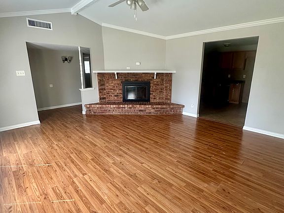 Charming home in a prime location just minutes from Grandscape! Step inside to an inviting open layout featuring a central brick hearth fireplace and rich wood-look laminate flooring throughout, with ceramic tile in wet areas for added durability. The soft neutral color palette offers a warm and welcoming feel. The spacious eat-in kitchen opens to an extended private deck through beautiful French doors perfect for indoor-outdoor living. The backyard boasts a large grassy play area and full privacy fencing, ideal for relaxing or entertaining. Enjoy the convenience of walking to the grocery store or public library. Located in highly rated Lewisville ISD and close to shopping, dining, recreation centers, pools, and more. Pets considered on a case-by-case basis. 40lb weight limit for pets, 2 pet max.