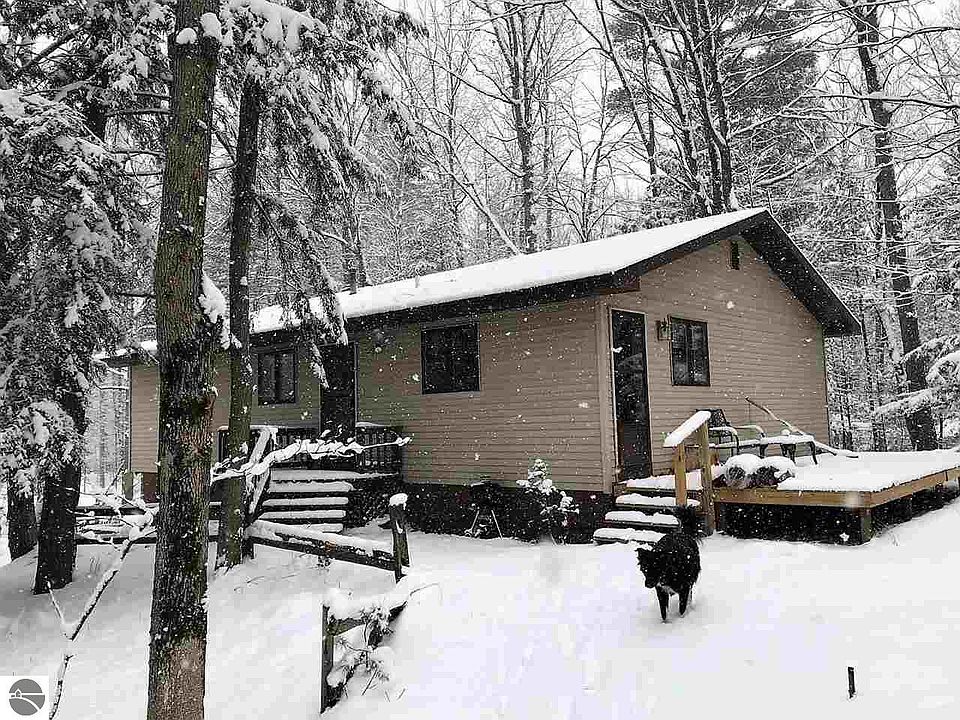 1.2 acre picturesque wooded setting for this 2 bedroom 1.5 bath home just 15 minutes from TC. You'll be a short drive to Bays & beaches, Mt. Holiday and within 10 minutes to Spider Lake access. This area offers great year-round outdoor activities, kayaking, fishing, hiking. State land around the corner, with deer and turkeys as frequent guests to the property. This is a quiet natural setting. Home has new bamboo flooring in the galley kitchen & dining room, and ceramic tile recently installed in laundry & adjoining bath. Open living dining area great space! 2 bedrooms with great closet space. House has an unfinished walkout basement which opens to a patio area offering great possibilities for outdoor relaxation. Other features include a newer furnace with a wood burning add-on, newer large deck off the side entrance and a detached 2 car garage.