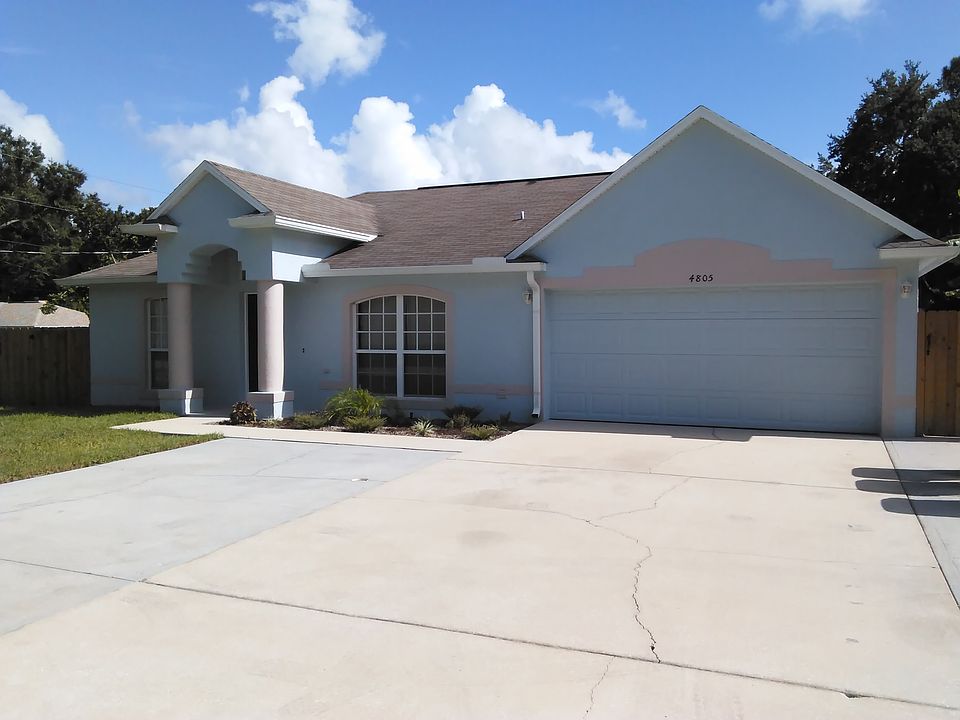 **GREAT BUY** Home features 3 bedrooms, 2 baths, 2 car garage and concrete block stucco built in 2002. Cathedral ceilings and large open floor plan that is great for entertaining friends and family. Home has new kitchen cabinets with granite countertops, new appliances, and new flooring throughout. The large corner lot is completly fenced in with 16' wide gate for parking boat or rv. 1402 sq ft living space under air, 1796 sq ft total. Backyard has 16' wide double gate with concrete pad for RV or boat. Seller will leave concrete pad as is or remove portion and replace with sod at buyers request. 321/258-8240 or 321/693-5617