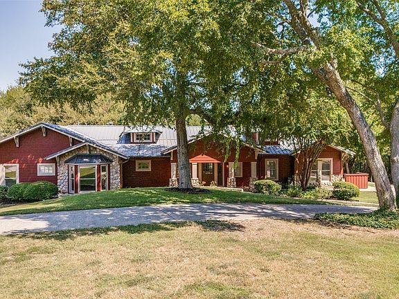 Spanning 4,188 sq. ft. on 8.95 acres, this stunning home offers 4 bedrooms and 3.2 baths. Inside, the family room showcases soaring cedar beams and a striking stone fireplace. The kitchen is filled with natural light from a towering skylight and a wall of windows overlooking the sparkling pool. The large formal dining room includes custom cabinetry and a charming window seating area, making it versatile enough to serve as a sunroom. The primary suite is a true retreat with its own fireplace, custom wood seating area, and access to a private sunroom. The fully renovated primary bath features sleek modern fixtures and sliding doors. Secondary bedrooms are generously sized, each with a built-in desk and dresser, while the Jack-and-Jill bath boasts dual shower stalls. The third bedroom includes a newly updated en suite bath. A spacious game room features extensive built-ins. The mud room includes a utility sink, built in cubbies and the utility room provides abundant storage and space for double washers and dryers. the utility room is also a SAFE ROOM. Step outside to an entertainer’s dream—an expansive lighted pavilion with multiple seating areas, each enhanced by a fireplace or fire pit. The fully equipped outdoor kitchen makes gatherings a breeze, perfectly situated near the sport court. A freshly paved travertine patio and walkway lead to the dazzling pool. There is a workshop on the property with 2 garage spaces. The main house has a 3 car garage and a 3 car carport. Adding even more versatility, the 1,052 sq. ft. guest house offers new flooring, a full kitchen, large bedroom with walk-in closet, and full bath. Kitchen and Bedroom doors open to the back patio with tranquil views of streams, waterfalls, a gazebo, and a pond. The entire property is framed by majestic trees.