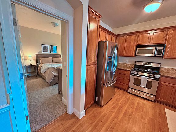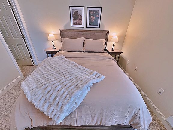 The kitchen, dining room, and living room is the focal point of the condo. You will find the 2 bedrooms conveniently on opposite sides of the condo for privacy. When you walk in, to the left you will find the first fully furnished bedroom with a queen bed, nightstands, dresser, a walk in closet. Connected is a full bathroom and has 1 vanity and 1 tub/shower combo. To the right, you will enter into the large primary bedroom with a king bed, nightstands, dresser, 2 walk in closets with large mirrors and bathroom with a walk-in shower. The primary bedroom has a view into the backyard with a large evergreen tree.