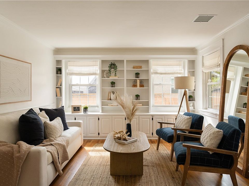 Brick fireplaceProfessionally landscaped backyardBuilt-in bookcaseGenerously-sized lotSpacious family roomCrown moldingsGranite counters
