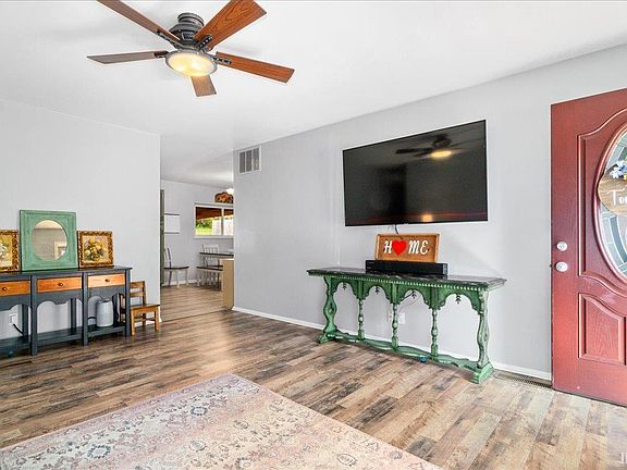 Roomy Ranch Style 3 bedroom 1.5 baths. Full Brick Exterior with front porch and covered patio in the back. Full Bath has been updated with all new fixtures. HVAC system replaced in 2022. Tastefully decorated with LVP flooring throughout. Kitchen is equipped with a new cook top, there is a wall oven, and the refrigerator is included also. Separate dining area with a large window offering a great view of the yard that has a tree line in the back with a fire pit. There are also 2 storage sheds for the gardening tools . The washer and dryer in the laundry room and the play set are also included in the sale of this house. Located close too schools, shopping, dining, bus line and is a walkable neighborhood.