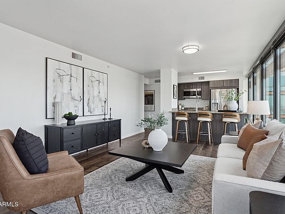Rare opportunity to own a truly special residence in the iconic Optima Biltmore Towers. Perched on the 12th floor, this coveted corner unit offers sweeping city and mountain views through dramatic floor-to-ceiling windows and a private balcony. The thoughtfully designed floorplan features a great room with luxury vinyl flooring and LED lighting, along with a sleek kitchen that has updated cabinetry, a gas range, newer stainless steel appliances, and a breakfast bar. The generous primary suite with an ensuite bath and walk-in closet is split from the second bedroom and hall bath. Full-size stackable washer and dryer. Enjoy resort-style amenities including a renovated rooftop pool and spa (reopening this summer), sundeck, barbecue area, fitness center, concierge services and more. Located in the heart of Phoenix, you'll love being just steps from premier dining, shopping, and entertainment. Dedicated parking space and storage locker in the secure garage.