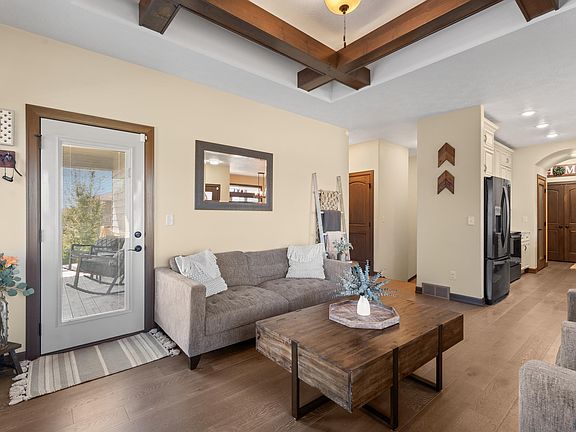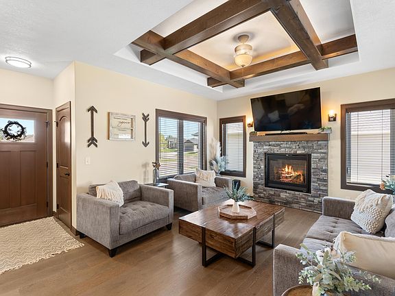 Walking up to the front door you'll notice meticulous landscaping and an epoxied front stoop. Right when you walk in, it just feels like home. The floor plan flows smoothly, and the details are all dialed in. The home features custom wood (Shaw Thousand Oaks) flooring, subtle up-lighting in the tray ceilings and upper kitchen cabinets, and main-floor laundry conveniently attached to the master closet. The kitchen includes quartz countertops, black stainless steel appliances, and a pantry. The living room features a cozy fireplace that’s perfect for winding down.