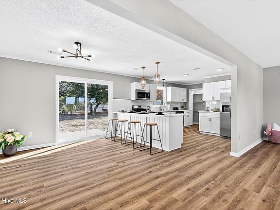 Move in ready, beautifully renovated 3-Bedroom Home with BONUS ROOM. Step onto the inviting front porch and into this beautifully updated home featuring a bright, open floor plan. The spacious living room flows seamlessly into the stunning kitchen and dining area, creating the perfect space for entertaining. The kitchen boasts elegant white cabinetry, quartz countertops, elegant backsplash, gold fixtures, stainless steel appliances, and a convenient large pantry. On one side of the home is the primary suite with a bathroom that features a luxurious walk-in tiled shower. Two additional bedrooms and a full guest bathroom. On the other side of the home through a charming barn door, discover a large bonus room—perfect for a home office, playroom, or additional living space—along with a spacious laundry/mud room. Step outside to a fully fenced backyard with peaceful views of the surrounding trees. For added peace of mind, the roof and HVAC were replaced in 2025, and recent renovations include LVP flooring, updated fixtures, cabinetry, countertops, and fresh paint throughout. Conveniently located in walking distance to beautiful Silver Lake, 3 miles from the Point at Barclay Shopping Center, 5 miles to the Hospital, and just 15 minutes from Carolina Beach, Point at Barclays, Riverwalk, and 15 minutes from downtown Wilmington, this home provides easy access to everything the area has to offer.