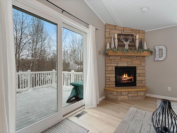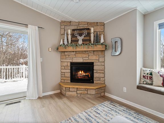 Welcome to this beautifully updated split-entry home set in a serene, semi-wooded setting—offering modern comfort, stylish finishes, and a layout designed for effortless living. The inviting stone-and-siding exterior sets the tone as you step into the bright, welcoming foyer that opens to an impressive main level with vaulted, wood-planked ceilings, an exposed beam, and abundant natural light. The living room features a cozy corner fireplace and a large picture window with built-in seating—your new favorite spot to unwind. The show-stopping kitchen and dining area blend beauty and function with a brand-new center island, stainless steel appliances, crisp white cabinetry, an amazing custom-built dining table, and a stunning wall of windows overlooking the private backyard. A newly added walk-in pantry offers exceptional storage and organization right off the kitchen. The main level includes two bedrooms, including a spacious private retreat complete with a walk-in closet and a luxurious ensuite featuring a walk-in shower and soaking tub. The fully finished lower level expands your living options with three additional bedrooms, another full bathroom—bringing the home to a total of three—and a fantastic laundry room straight out of a magazine, complete with a bonus laundry chute. A striking fireplace feature wall anchors the lower-level family room, creating yet another warm and inviting gathering space. Outside, you’ll enjoy a spacious yard equipped with a swing-set for play and a custom firepit area perfect for entertaining. With thoughtful updates throughout, a versatile floor plan, and a peaceful wooded backdrop just minutes from town, this home delivers the perfect blend of comfort, privacy, and modern living. A rare opportunity—don’t miss your chance to make this beautiful property yours.