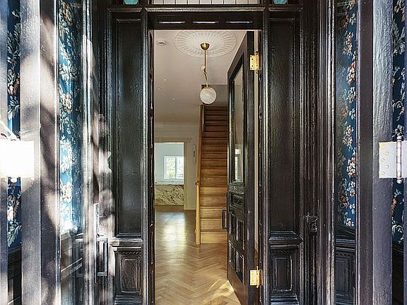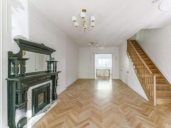 Behind the striking restored façade, you’ll find a home that perfectly balances timeless craftsmanship with modern sophistication. The parlor level is breathtaking—anchored by a dramatic original black marble fireplace, intricate moldings, and soaring ceilings that bathe the living space in natural light. Rich herringbone oak floors flow seamlessly from the grand double-door entry to the rear terrace, creating an effortless sense of openness and refinement.