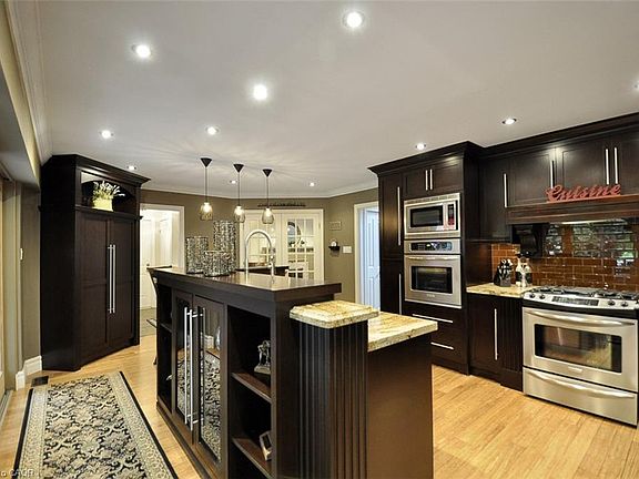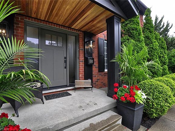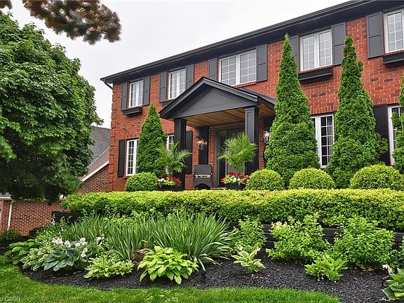 This stunning custom-built executive home blends charm, elegance, and everyday comfort. Nestled in one of Kitchener's most desirable areas near the Grand River and walking trails, it sits on a private, professionally landscaped lot with a park-like setting an entertainer's dream. A major exterior renovation was completed in October 2024, featuring a new 50-year shingled roof, new ridge-venting, new eaves, soffits, fascia, full attic insulation, chimney re-pointing with custom cap, rebuilt cedar porch with pillars, shutters, window boxes, Hinkley lighting, and a new custom Masonite front door with sidelights (July 2025). These updates elevate both curb appeal and peace of mind. Inside, natural light floods the home through the new entryway and detailed colour updates. The newly updated staircase is stunning and invites you to explore further. Venture into the custom-designed gourmet kitchen with granite counters, built-ins, and 20' Anderson doors opening to lush gardens and updated 3-tiered deck designed for beautiful daytime to stunning night entertaining. The dining room features custom cabinetry and beautiful chandelier, opening to the large and spacious formal living room, while the family room offers a cozy wood-burning fireplace. A custom laundry room with quartz counters and Miele appliances completes the main floor. Upstairs, the master retreat includes a spa-like ensuite, new skylight, California shutters, and a dream walk-in closet with custom storage and lighting. Two additional spacious bedrooms share a five-piece bath with luxury finishes. Bathrooms throughout feature custom cabinetry, granite or quartz counters, soaker tubs, and glass showers. The basement includes a bedroom and awaits your finishing touch. The garage is fully upgraded with epoxy floors, heater, EV charger, new custom doors and opener-perfect for the car enthusiast! This home not only offers timeless elegance and thoughtful upgrades, but also worry-free living for years to come.
