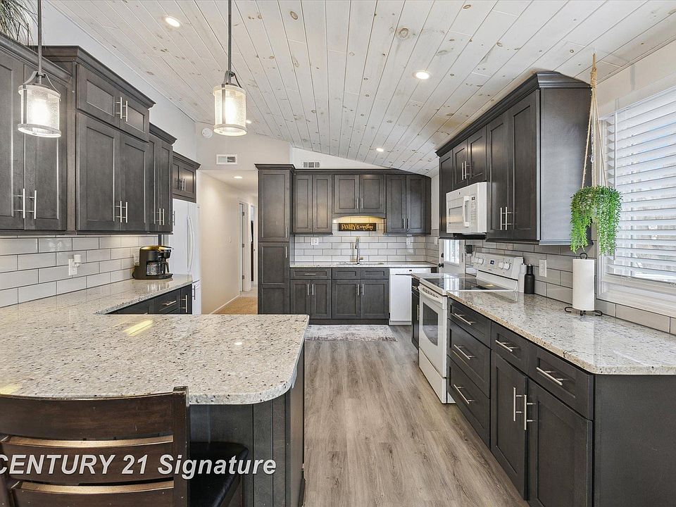 FLAWLESS ON FIVE MILE Everything is already done and you'll feel like you're "home" upon entering this warm and inviting open space with every detail more enticing as you go! From the elevated tongue and groove pine wood vaulted ceilings in almost every room on the upper level to the massive GORGEOUS updated kitchen with extensive custom soft close cabinetry and beautiful granite counters including the lovely breakfast bar and separate dining area! You definitely won't run out of storage room! The pleasing primary bedroom with it's walk in closet and added vaulted tongue and groove ceilings will win you over in addition to the other two considerably sized bedrooms on the upper floor all with sizeable closets and a large full bathroom as well. The inviting lower level has a MASSIVE family room along with an open room that could be closed off easily if desired and would be great as an office or play room area. PLUS another substantial 4th bedroom with large storage area and 2nd full bathroom. The Oversized laundry room has loads of room for folding your clothes. Out back is the enjoyable 12x28 full length maintenance free composite deck with PVC spindles and railing perfect for just hanging out and relaxing or grilling your dinner! The 22x24 attached garage with newer door and opener is a pleasant addition to this already perfect home!