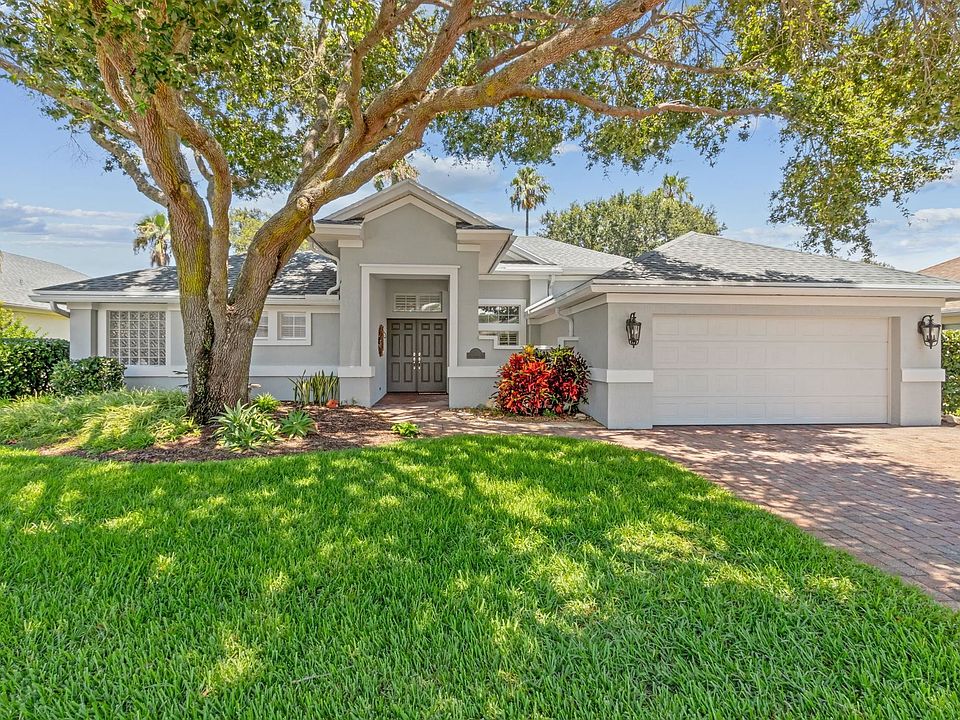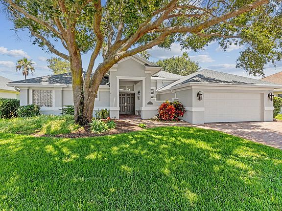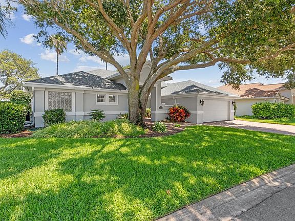 Ocean Palms lakefront pool home! This beautifully maintained 3bd/2ba with additional flex room/art studio offers a spacious 2,370 square feet of heated and cooled space and is loaded with thoughtful features that every buyer will appreciate. Upon arrival, you are greeted by a half wall courtyard to enjoy the sunsets every evening, beautiful stain glass windows and plantation shutters in the entry, expansive lake views from the moment you enter the home and that is just the beginning. The inground pool and spa are saltwater, solar heated and screened in. There is an additional open patio off the screened lanai to enjoy the lake views and nature. The garage was extended by 5 ft. to accommodate a workshop area and there is plenty of room to accommodate your vehicles securely. Most rooms were extended from the dining room to accommodate the built-ins with stain glass, to the guest bedroom offering plenty of extra storage and built-ins, to the family room to accommodate the cozy gas fireplace, and the 3rd bedroom offers a Murphy bed and has direct access to the flex room/art studio so would make a great in-law suite for those with long term guests but the possibilities are endless depending on your needs. Additional features include a new roof and A/C in 2018, brick paver driveway and front entry, new pool heater in 2021, there is are two water purifiers and a water softener under contract with Culligan, the exterior was freshly painted in 2021, and seamless gutters with covers and fascia were added in 2022. The community of Ocean Palms offers great amenities from the dock on the Intracoastal, pool, spa, park, tot lot and picnic area. The beach, restaurants and shops are all close by!