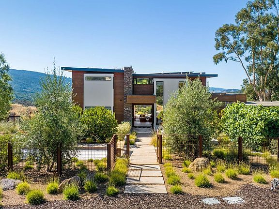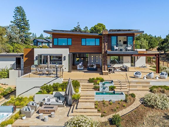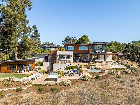 481 West Maple Way, Woodside is a contemporary gem with awe-inspiring views of the western hills and Crystal Springs reservoir. This home showcases clean lines, soaring ceilings, and an abundance of glass creating a seamless integration with the outdoors. The open-concept layout is ideal for entertaining. A gourmet chef's kitchen with top-of-the-line appliances and a large center island is a focal point. The living and dining areas provide a comfortable and stylish setting from which to admire the view. The master suite is a private sanctuary with a spa-like en-suite bathroom and spacious walk-in closet. The separate studio cottage with full kitchen provides flexibility. Expansive outdoor living spaces include beautiful native plants, a large terrace for al fresco dining, an outdoor living room, soothing hot tub, and putting green. This property combines the best of both worlds serene seclusion and proximity to the vibrant amenities of Silicon Valley and top-rated schools.