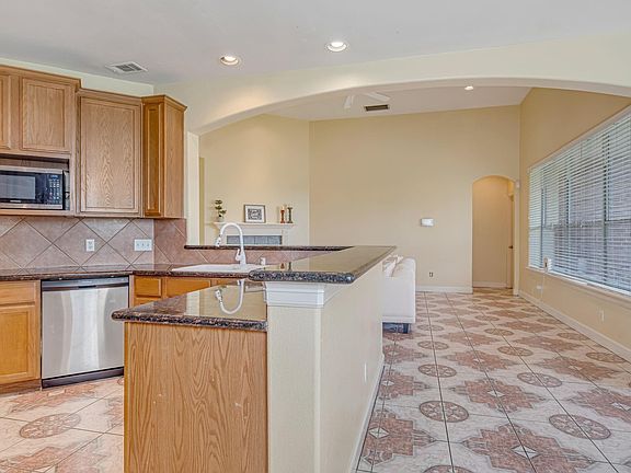 Welcome Home! This stunning 4-bedroom 2-bath residence-Built with durable brick and reinforced concrete (Stahlbeton) construction—designed for lasting strength and energy efficiency. Inside find soaring ceilings, tile flooring throughout (no carpet) an open floor plan filled with natural light. The kitchen showcases granite countertops, a bright dinning area, opens seamlessly to the spacious family room with a cozy gas fireplace—perfect for everyday living and entertaining. The primary suite offers double sinks, a relaxing soaking jacuzzi, and a separate shower. Generously sized bedrooms with large closets provide comfort for the whole family.