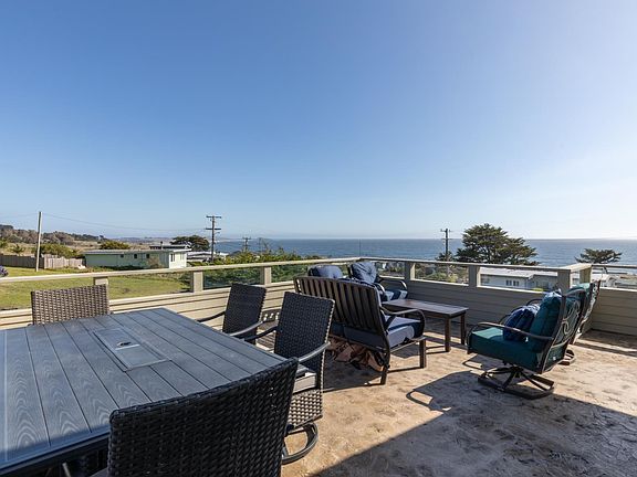 What's not to love about this stunning, like-new home with breathtaking ocean views from every room? Enjoy wraparound, glass-enclosed decks perfect for whale watching, soaking in the sun, or entertaining with sunset views. The patio is fully furnished with a dining set, firepit, and outdoor living room setperfect for relaxing or hosting. Inside, beautiful slate, Berber carpet, and maple wood create a warm, inviting feel. Two spacious master suites each feature a king and a queen/full-size bed, plus there's an upstairs Murphy bed for extra guests. Three full bathsall updated and in excellent condition. The open Kitchen/Dining boasts a granite tile island bar, stainless appliances, and tasteful furnishings. An automatic chairlift provides easy access to the upper level. Extras include an EV charger and a low-maintenance yard. Out back, rolling hills bring morning cows; out front, the beach is just across the streetcoastal living at its best!