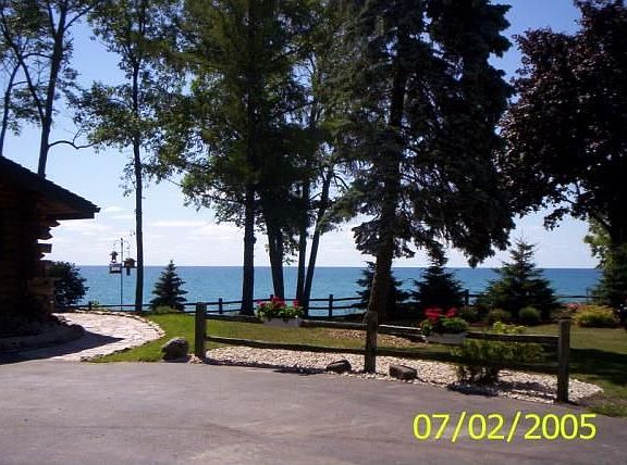 Imagine driving into your long private tree-lined driveway to an electric gated entrance. You will notice the split-railed fence around your entire property. You can't miss seeing the blue water of Lake Michigan ahead of you on your 1.5 acres of land. Continue down the drive, passing pear and apple trees. On your way, note the two wood barn sheds holding your "stuff". All the stresses of the day will leave your body and mind when you know that your mint condition full log cabin is yours. Walk on to the large L-shaped custom deck with hot tub facing the lake and imagine yourself enjoying relaxing time anytime you want. Enjoy cookouts and watching lake activities from this deck. Walk back to the stone pathway and head towards the lake on to a small deck. You'll see a 10x10 sandbox to the left to be used just for fun. To the right and under a large tree, take a seat in your lounger or swing chair, relax with a drink and view the boats, jetskiers, or barges crossing the lake. You can even see Chicago on a clear day! Go down the stairs from the small deck leading to the water where you will be on a larger deck and picnic table. If you like, fish off the rocks on a walkway built on the rocks or walk down and swim in Lake Michigan! Go back up the stairs and enter your home by opening a three inch original wood door to see the livining/dining room area with a 10' vaulted ceiling, three skylights and a huge wood-carved bear in the corner who has been waiting for your arrival! Walk on the original refinished "penny" hardwood floors in living room, bedrooms and hallways; if cold, turn on the fireplace (either wood or gas) and look through your new Pella picture windows and sliding door windows with unobstructed views of the lake. If you want to go upstairs, turn on the stair step lights (if it's dark) and walk up the half-log stairs with custom handrail posts that match your deck. You will see your books in the built- in bookcase and a l