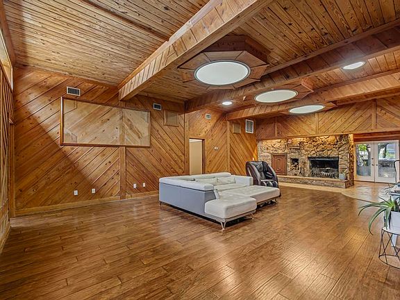 From the moment you enter, you're greeted by a large bright living room with vaulted ceilings and custom natural wood walls. A grand, sun-drenched living room flows effortlessly into multiple lounge areas, while unique architectural touches and vibrant finishes create a warm, curated atmosphere throughout.