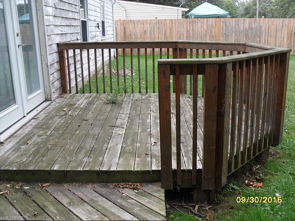 Spacious 2 bedroom 1 bath with jacuzzi tub. Updated eat in kitchen with white cabinets, custom louvered shutters, stainless steel GE dishwasher and microwave. Family room has built in floor to ceiling book cases with French doors to private deck. Window treatments. Plenty of closet space. Great walking and biking neighborhood, with lake views. Newer roof and windows freshly painted inside and out. Home is wood and vinyl sided. Attached garage with opener. Asphalt drive.