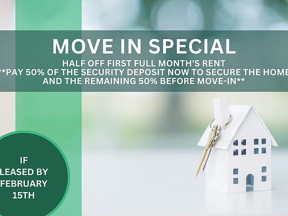- Special offer! **MOVE-IN SPECIAL! HALF OFF FIRST FULL MONTH'S RENT IF LEASED BY FEBRUARY 15th **PAY 50% OF THE SECURITY DEPOSIT NOW TO SECURE THE HOME AND THE REMAINING 50% BEFORE MOVE-IN**