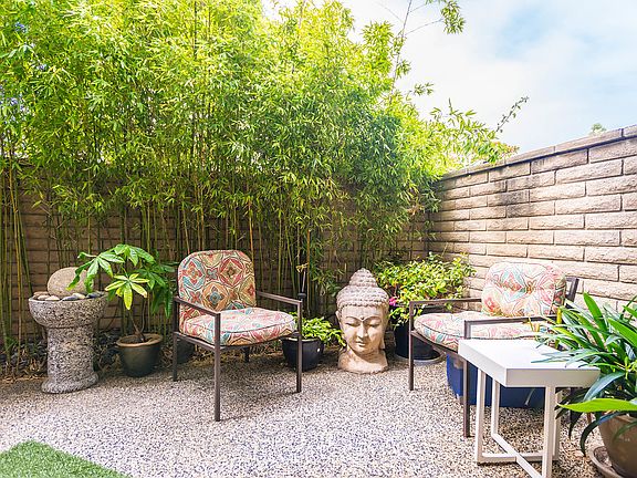 Balinese tranquility, Japanese Zen, and mid-century cool harmoniously intersect at this airy, understated Marina del Rey townhome. A leafy, verdant approach from the end of a quiet cul-de-sac sets the tone for a peaceful retreat inside. Gleaming hardwood floors in the entry span the entire home. Bathed in natural light, the living room features a gas fireplace, 12ft ceilings, built-in speakers, and access to a private, bamboo-framed patio. Beyond the formal dining room find an updated kitchen with custom walnut cabinets, stainless appliances, and labradorite counters. Two spacious bedroom suites comprise the top floor, highlighted by a master with barrel vaulted ceilings and a sunny balcony overlooking the wetlands. Bathrooms all feature copper quartzite floors, Tansu vanities, and handmade crackle tiles. Conveniences abound to match the home's aesthetics: in-unit laundry, a powder room for guests, direct access garage, endless storage, and the lowest HOAs on the Villa Marina corridor.