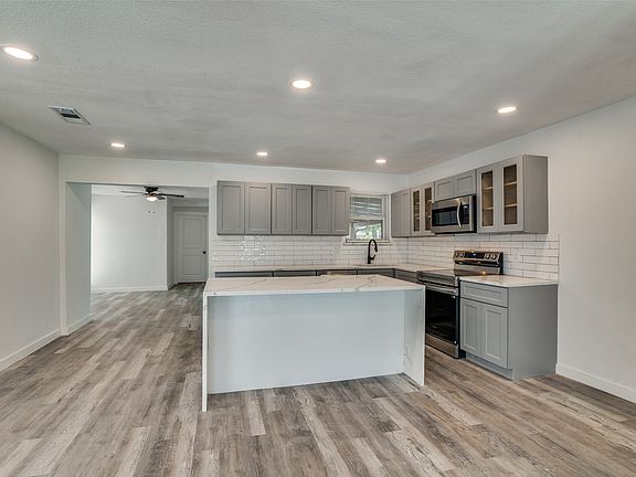 Step inside to find a stunning family room that opens to an updated kitchen and stylish bathrooms, all designed with timeless finishes. You’ll love the no-carpet interior featuring durable tile and luxury vinyl plank flooring throughout. Many new windows bring in abundant natural light, while all-new lighting fixtures add a fresh, modern touch. Bathrooms include stylish vanities and beautiful tile and finishes. This kitchen!! Wow!!! The island is amazing with quartz waterfall counter and new shaker cabinets.