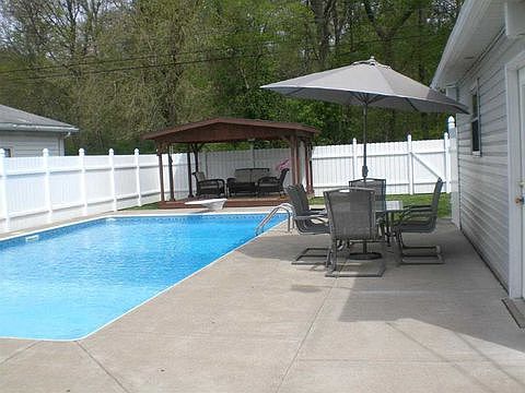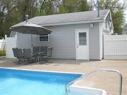 Take a look at this diamond! The house and yard has been meticulously cared for, The home features an open floor plan with a nice eat in kitchen that has lots of cabinet space and newer appliances. The living room has plenty of space and has a nice large picture window to let lots of natural light in. The home has newer laminate floors and tiled kitchen. The master bedroom has french doors leading to a large closet/dressing area or could be used as a third bedroom. Bathroom has updated sink and fixtures. 2nd bedroom has two large closets for storage. The home seems much bigger and would be ideal for first time homeowner or a downsizer. The owners have done lots of updates and maintenance along with putting in a large heated salt water pool and nice covered deck in back for entertaining. New pool liner in 2017. The backyard is like stepping into your own resort. Per the owners ( furnace replaced in 2003 water heater 2005, ac 2009,roof and decking 2009, pool 2006, newer siding and laminate flooring) The property has a privacy fence an large heated garage with 100amp service. Also there is a storage shed that stays with electric and air compressor piped to garage. You will not find a better cared for home. Feel free to call me with any questions. 812-217-1953