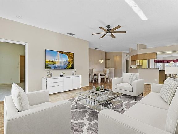 Discover Your Dream Home with Tranquil Pond Views! Welcome to this meticulously maintained Opal Model home, where elegance meets comfort. From the moment you arrive, the lush landscaping and screened entry set the stage for what lies within. The exterior boasts a roll-up garage screen and a neutral palette that complements the serene surroundings. Step inside to find a wealth of updates that enhance the home's appeal. Luxury Vinyl Planking graces the floors, while granite countertops and wood kitchen cabinets add a touch of sophistication. The kitchen island and full stainless steel appliance package make this space as functional as it is beautiful. The property features a separate laundry room equipped with a washer and dryer, ample storage, and an abundance of natural light streaming through large windows and a bathroom skylight. The Florida Room, with its decorative beadboard and Thermal Windows, offers a cozy cottage vibe and direct access to the backyard pond—perfect for entertaining or simply relaxing. Additional highlights include undercabinet lighting, a transferable termite bond as well as in-home pest control, a 2024 water heater, a 2021 roof, and a 2016 HVAC system, ensuring peace of mind for the new homeowner. With three bedrooms, two bathrooms, and nearly 1,800 square feet of under-air living space, this home is move-in ready for those who prefer not to make any improvements. Located in the vibrant Royal Highlands community, this home offers access to an 18-hole senior championship golf course, two pools, a fitness room, a Great Hall, a Recreation Center, a driving range, and various courts. The gated community is perfect for active 55+ residents looking for a plethora of clubs and activities. Plus, it's conveniently close to MCO, amusement parks, restaurants, shopping, and The Villages Entertainment. Don't miss the opportunity to make this gorgeous home yours. Book your tour today!