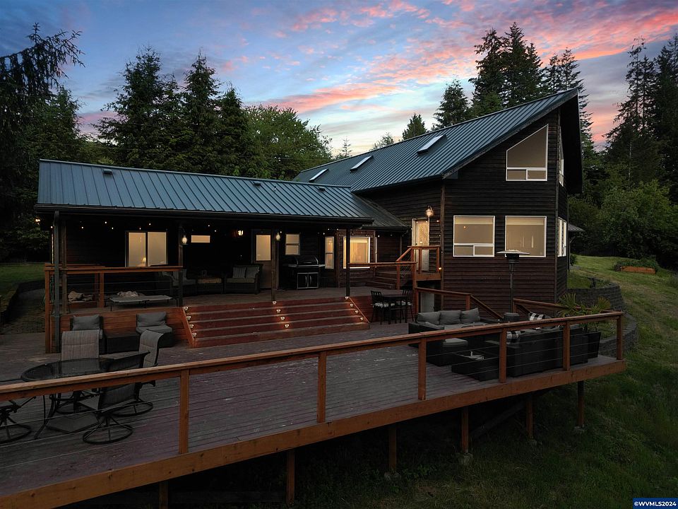 Stunning custom-built lodge on 3.5 acres in Oregon Coastal Range. LVP flooring throughout & living room w/ vaulted ceilings, floor-to-ceiling windows & gas fireplace w/ built-in wood surround. Dining area w/ vaulted ceilings & skylights. Kitchen w/ beautiful cabinetry, pantry & eat bar. Primary suite w/ wall of windows, door to the deck, walk-in closet & bathroom w/ double sinks & jetted tub. 2 more bedrooms & full bathroom Upstairs has loft vaulted ceilings & skylights. Mudroom w/ door to the deck.